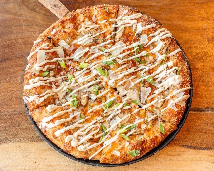 Extra virgin olive oil, roasted garlic, mozzarella & provolone blend, white cheddar cheese, caramelized onions, crimini and shitake mushrooms, topped with a garlic aioli drizzle and black truffle oil, finished with shaved parmesan cheese and fresh scallions