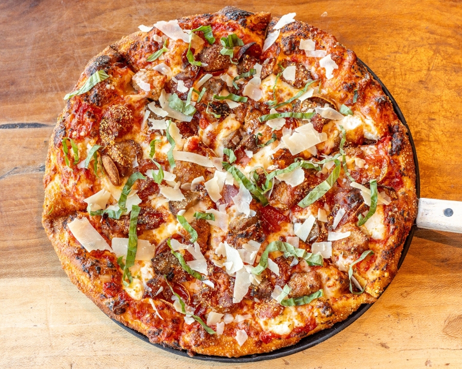 Extra virgin olive oil, house tomato sauce, mozzarella & provolone blend, pepperoni, mushroom, red onion, green pepper, and sausage. Finished with pecorino Romano and oregano