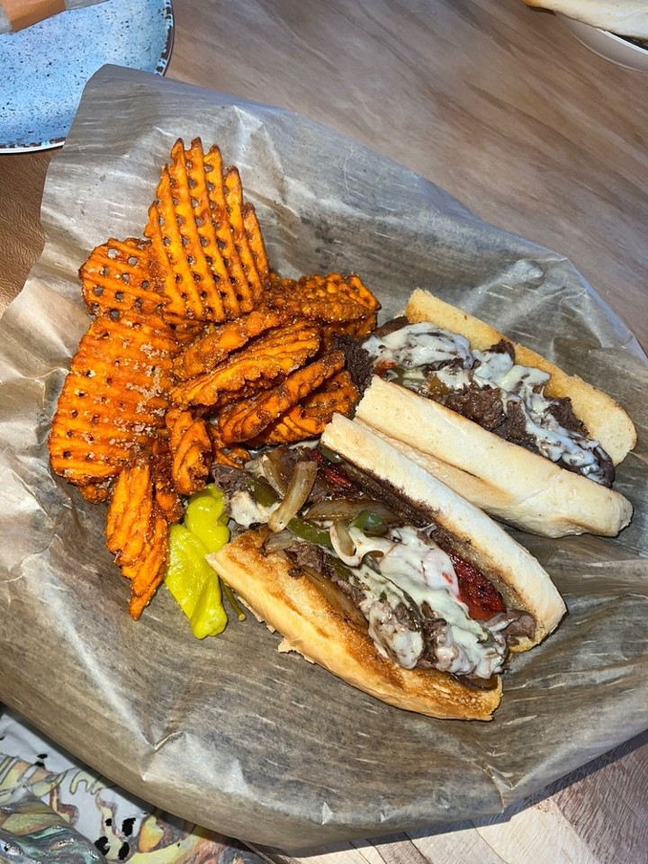 Shaved Angus steak, onions, mushrooms, roasted peppers and provolone cheese on a toasted 10” Italian roll.