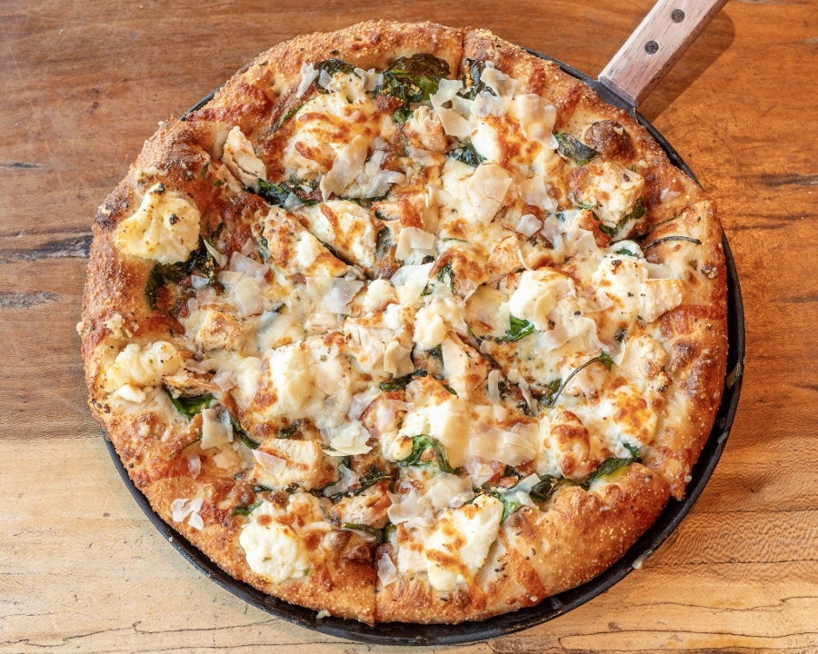 Extra virgin olive oil, roasted garlic, mozzarella & provolone blend, ricotta, fresh leaf spinach, chicken, pecorino Romano, oregano, finished with shaved parmesan