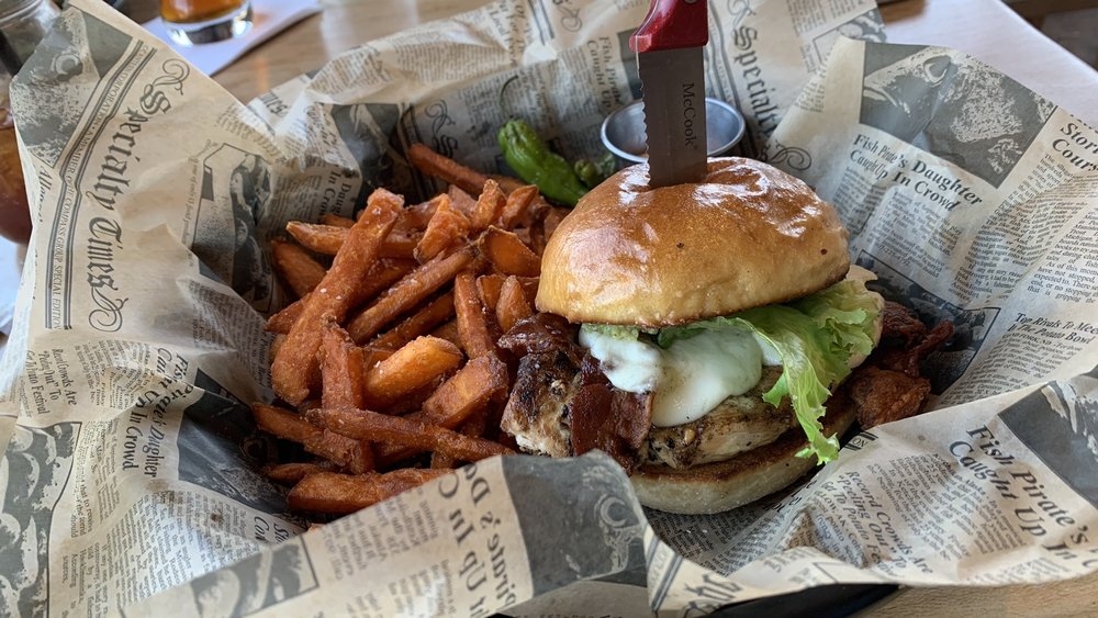 Grilled chicken breast, bacon, avocado, fresh mozzarella, lettuce, and tomato, served on a toasted brioche bun.