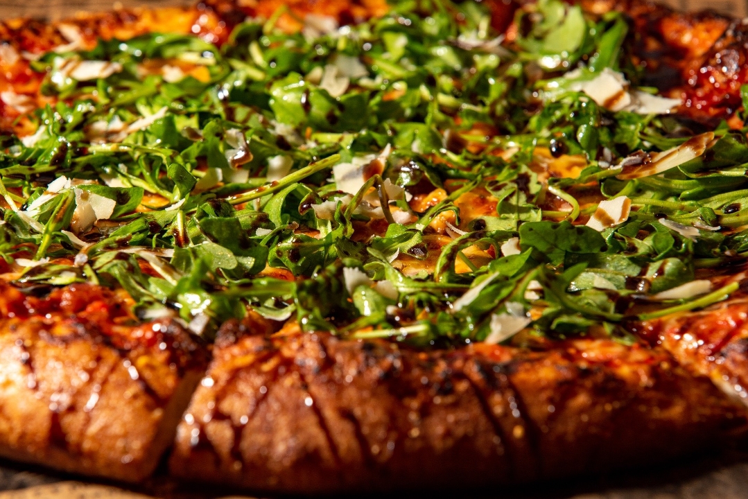 Extra virgin olive oil, house tomato sauce, mozzarella & provolone blend, pecorino Romano, oregano, topped with a bed of fresh arugula tossed in house dressing, finished with a balsamic glaze drizzle and shaved parmesan